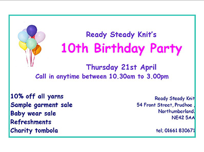 On Thursday 21st April Ready Steady Knit will be having our 10th Birthday Party. Call in any time between 10.30am and 3.00pm to help us celebrate. We’d love to see you there. During the day we will have: 10% off all yarns Sample garment sale Baby wear sale Refreshments Charity tombola